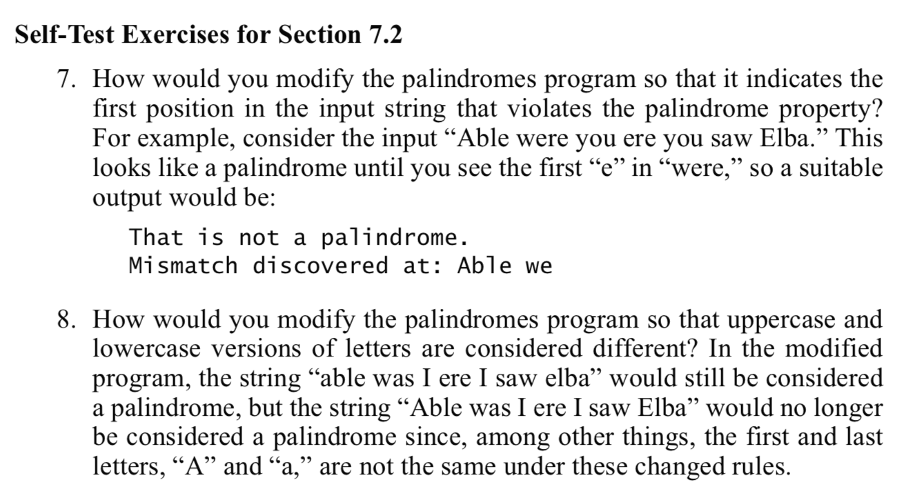 Your book has the Palindrome.java sample program. Please refer to the Self-Test Exercises for Section 7.2,
